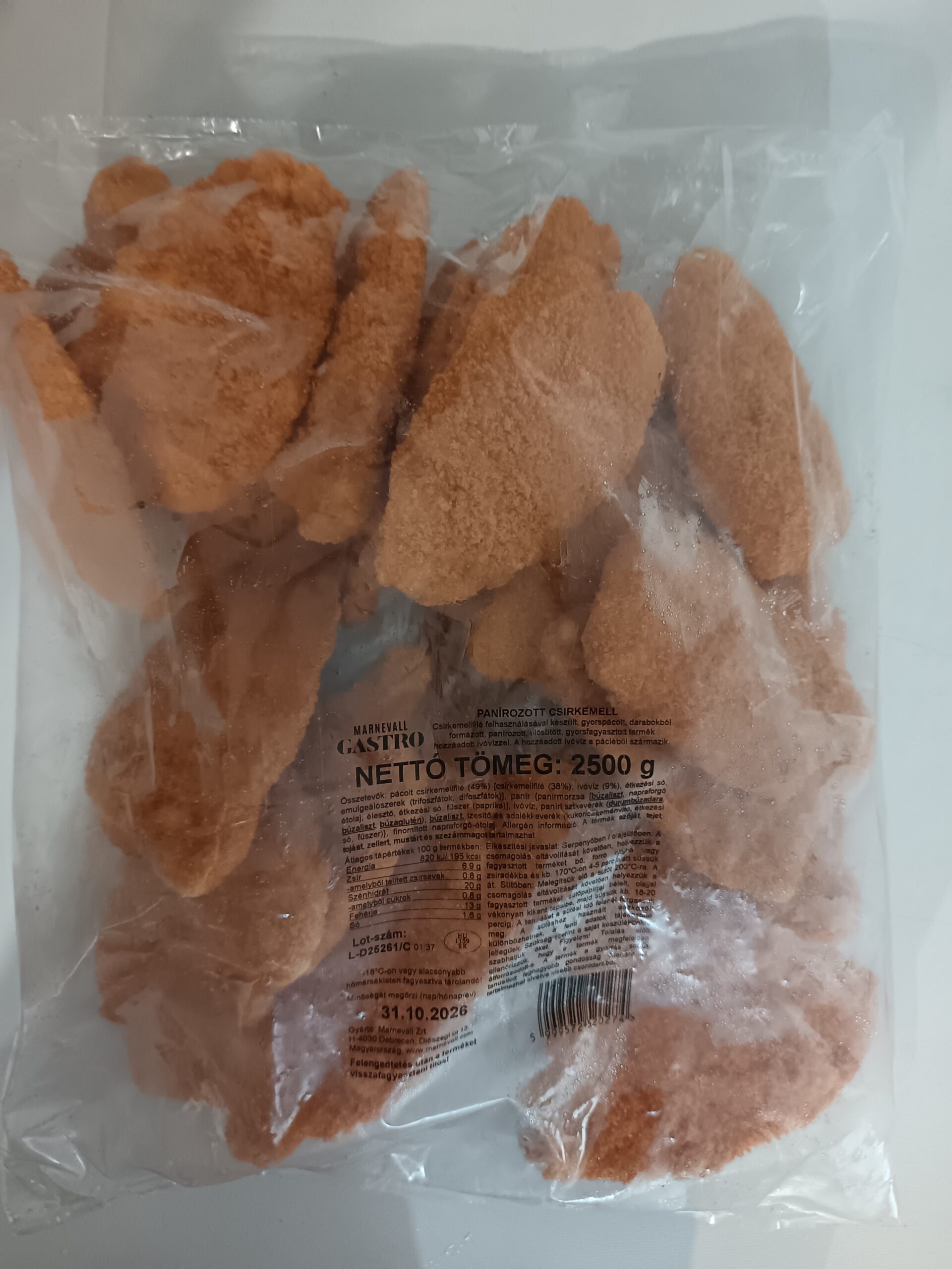 „Összetevők: pácolt csirkemellfilé (49%) [csirkemellfilé (38%), ivóvíz (9%), étkezési só, emulgeálószerek (trifoszfátok, difoszfátok)], panír {panírmorzsa [búzaliszt, napraforgó étolaj, élesztő, étkezési só, fűszer (paprika)], ivóvíz, panírlisztkeverék (durumbúzadara, búzaliszt, búzaglutén), búzaliszt, ízesítő és adalékkeverék (kukoricakeményítő, étkezési só, fűszer)}, finomított napraforgó-étolaj.