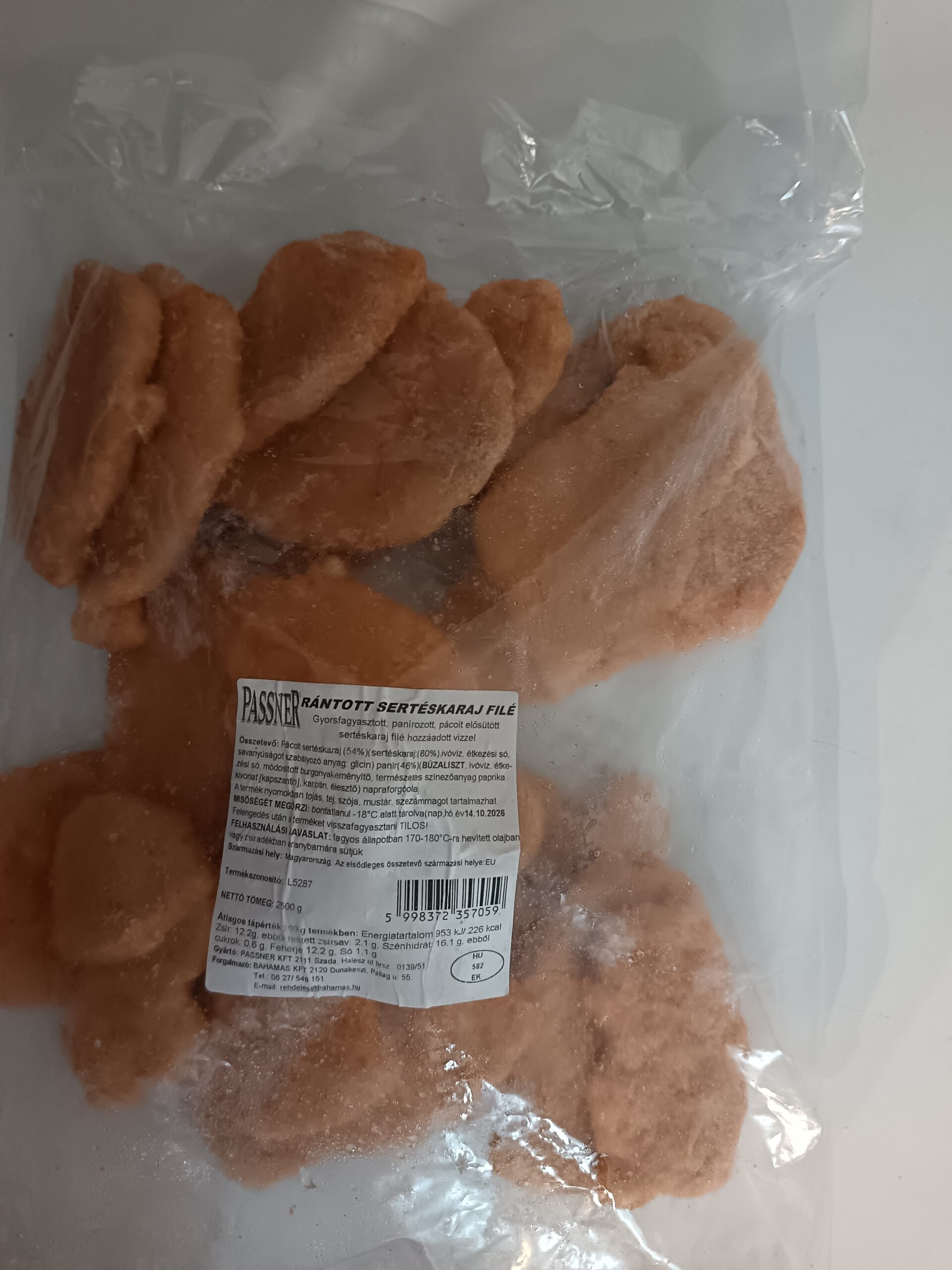 „Összetevők: Pácolt sertéskaraj (54%) (sertéskarajfilé: (80%), ivóvíz, étkezési só, savanyúságot szabályozó anyag: glicin), panír (46%) (búzaliszt, ivóvíz, étkezési só, módosított burgonyakeményítő, természetes színezőanyag paprika kivonat [kapszantin], karotin, élesztő), napraforgóolaj.